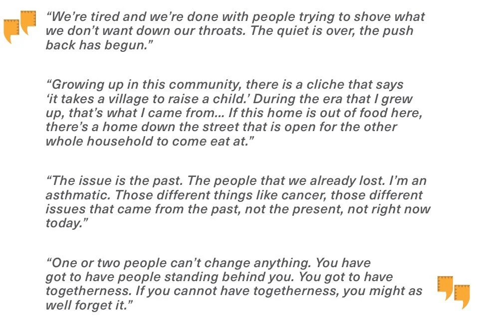 The community interviews revealed powerful insights that fundamentally shifted our design direction, with residents expressing "We're tired and we're done with people trying to shove what we don't want down our throats" and that "You have got to have people standing behind you" for real change. These quotes highlighted the need for collective action and authentic community agency, leading us to map the complex stakeholder ecosystem rather than impose top-down solutions. The interviews revealed that issues weren't just about environmental pollution, but about power dynamics and communication breakdowns—insights that directly informed our development of Table Talk as a tool for facilitating more equitable multi-stakeholder dialogue.