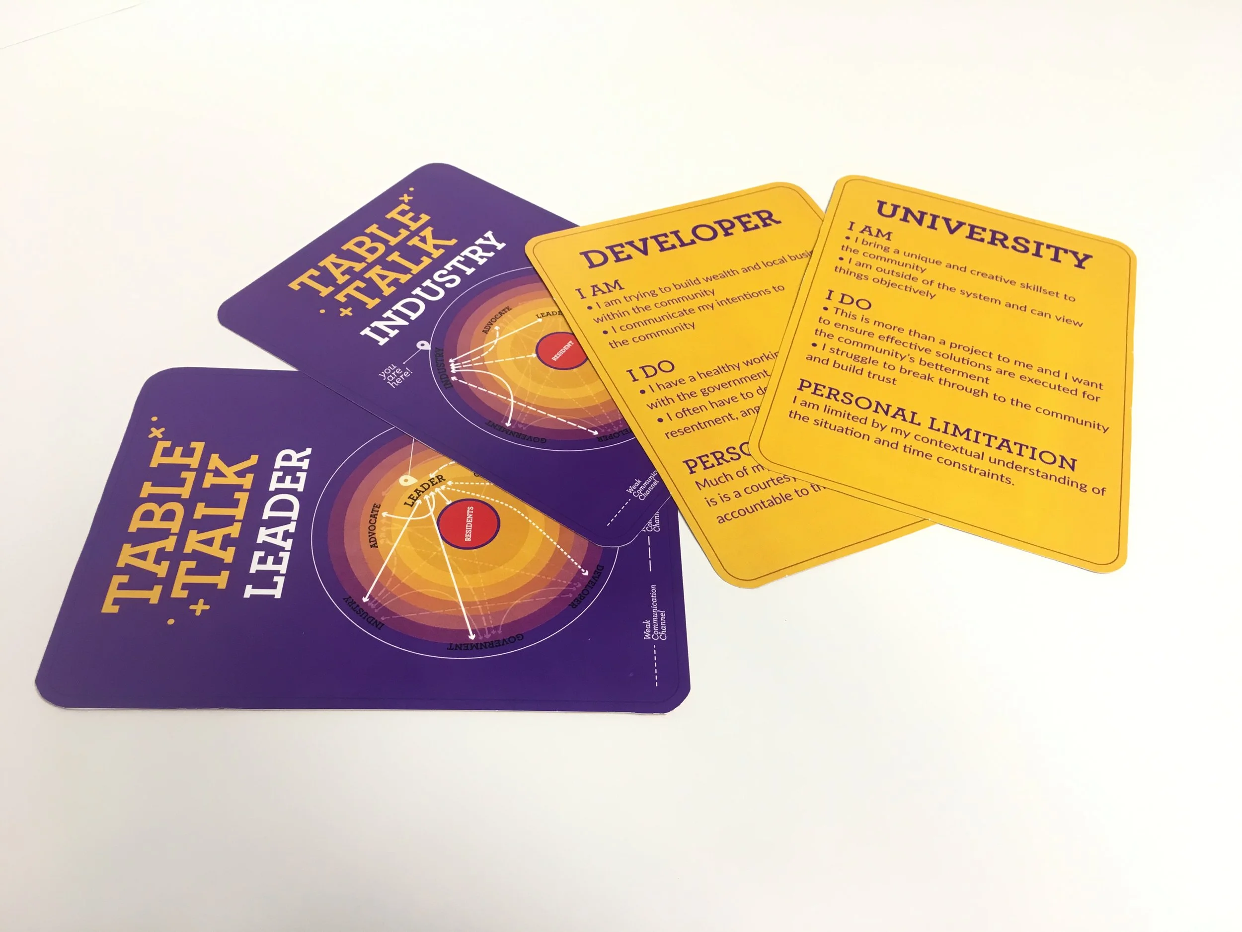 Our design solution is "Table Talk," a multi-stakeholder toolkit that uses roleplay interaction, collaborative problem solving, and generative communication to build effective dialogue between Hudson Hill residents and external stakeholders. The toolkit includes character archetype cards based on primary research, collective issue cards, disruption cards that introduce real-world complications, and motion cards to keep conversations productive when participants reach impasses. Players assume roles of different stakeholders (residents, government officials, industry representatives, advocates) to work through community issues while building empathy and understanding across different perspectives. The game concludes with individual and group reflection cards that assess the quality of collaboration and potential for moving forward with proposed solutions. Table Talk was designed to be facilitated by community organizations like Harambee House to promote more equitable partnerships and decision-making processes in Hudson Hill's ongoing environmental justice efforts.